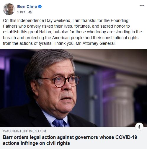 At a moment when the COVID-19 cases are increasing in 40 of 50 states– when states like Texas which ignored warnings and reopened too early are reversing course and imposing restrictions– Cline has approvingly posted on Facebook a report from April about Attorney General Barr’s order to US attorneys to “consider legal action against governors if their efforts to stop the spread of the new coronavirus infringe on Americans’ civil rights.”