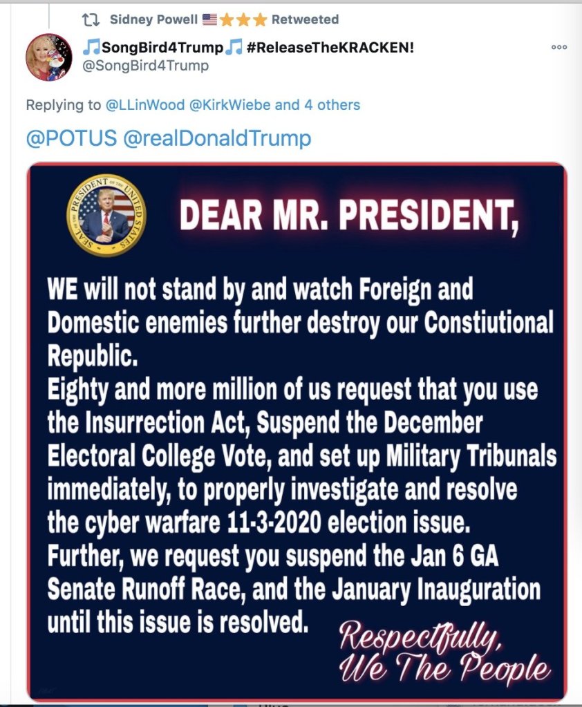 Donald Trump’s former attorney Sidney Powell– Congressman Cline’s “friend” whom he is “proud to support”— has retweeted a call for Trump to suspend the December Electoral College vote and the January inauguration, and to set up “military tribunals” to investigate the recent election.