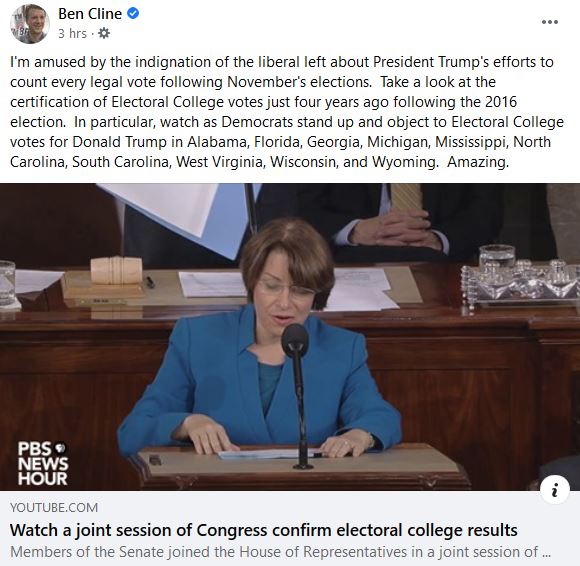 Almost a week after the Electoral College affirmed the victory of Joe Biden and Kamala Harris in the 2020 election, Congressman Cline posted this on his campaign Facebook page: