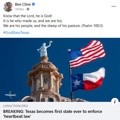 Congressman Cline is celebrating the passage of a Texas law that effectively outlaws legal abortion in the state (including in cases of rape and incest) to be enforced through a system of paid informants reminiscent of the Taliban and the East German Stasi.