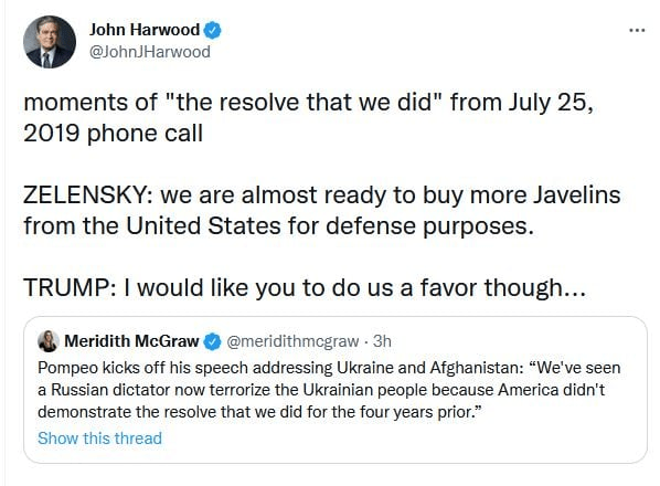 Does Cline agree with former secretary of state Mike Pompeo that Trump showed “resolve” in defense of Ukraine?