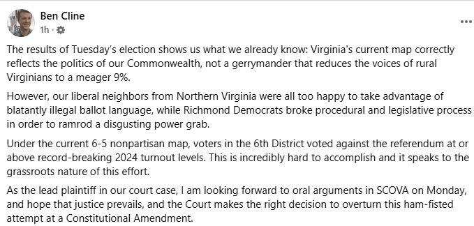 Nearly 48 hours after his previous post, Cline emerged to announce that he is the lead plaintiff in the court case seeking to overturn the will of the majority of Virginia voters.